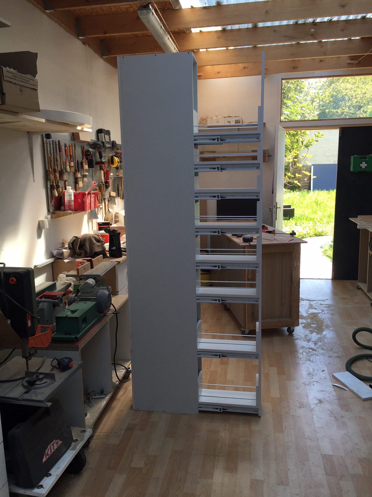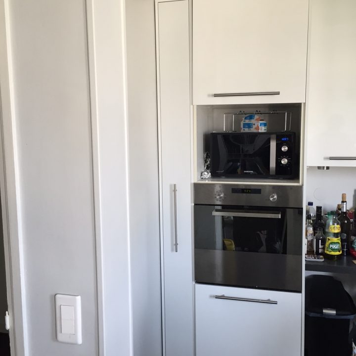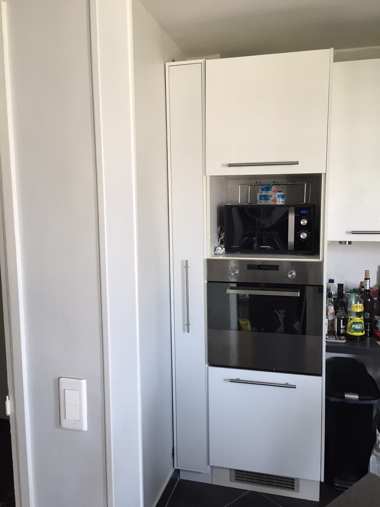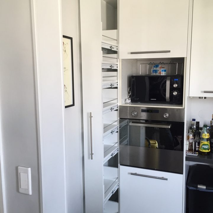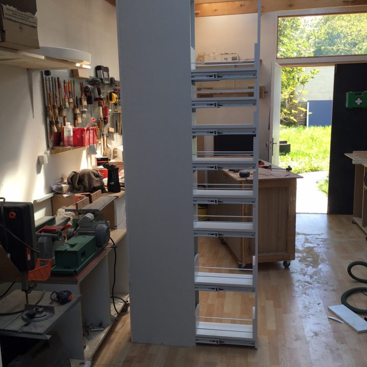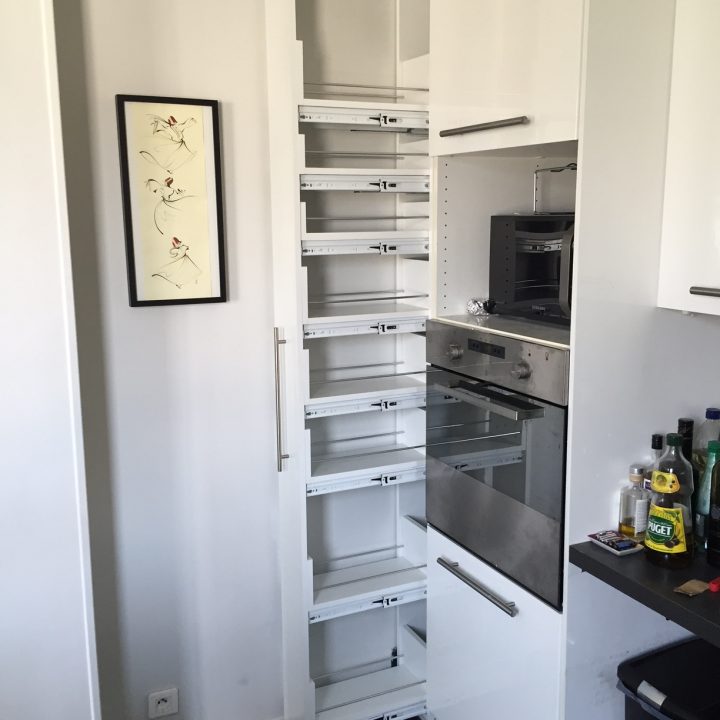 Notre solution : En atelier, nous avons fabriqué une colonne de cuisine sur mesure composée exclusivement de rangements de type tiroirs et nous avons installé, littéralement glissé, l’élément dans l’espace prévu à cet effet. Ainsi, nous avons pu optimiser un espace trop restreint pour y faire quoique ce soit a priori.