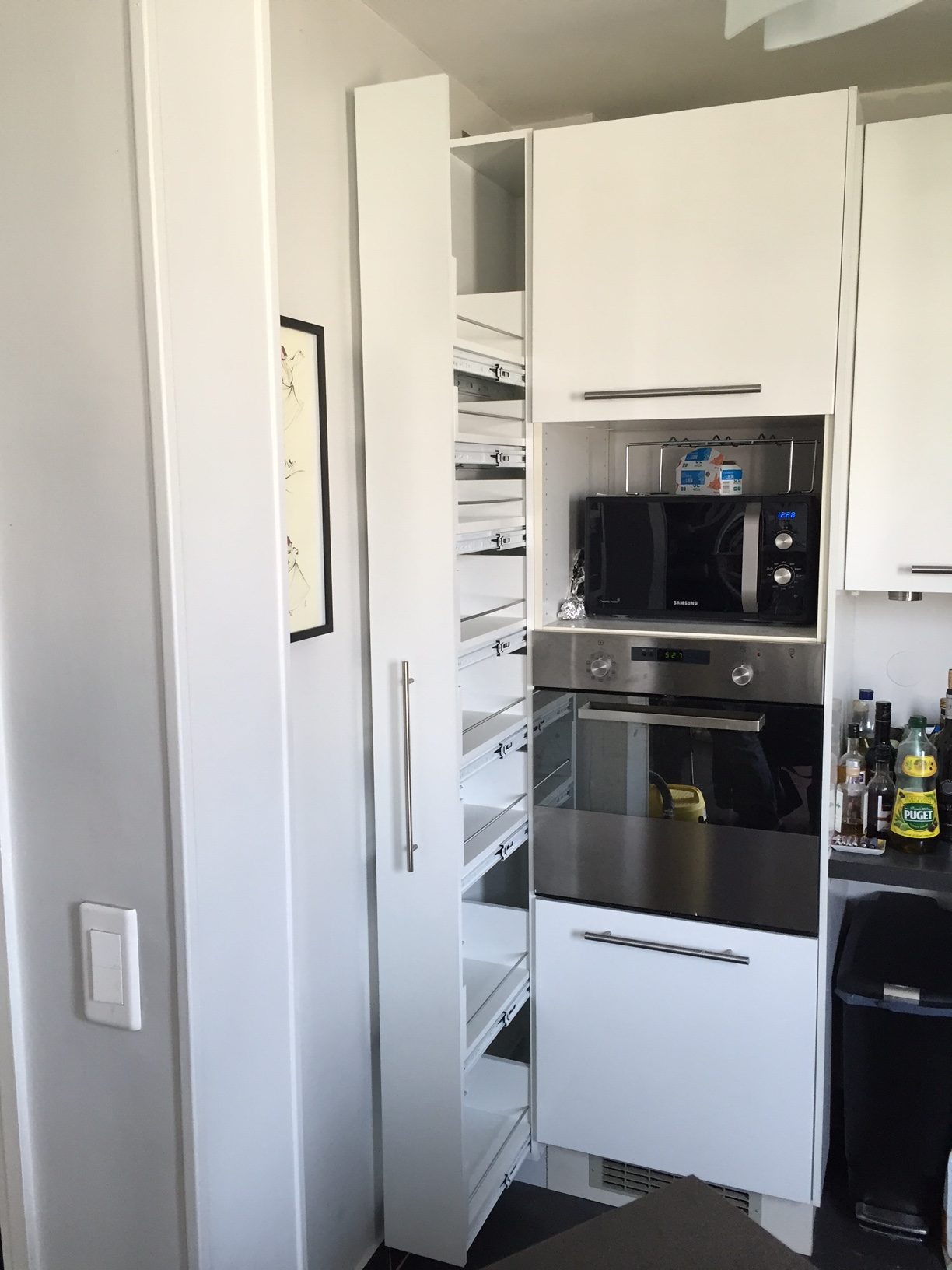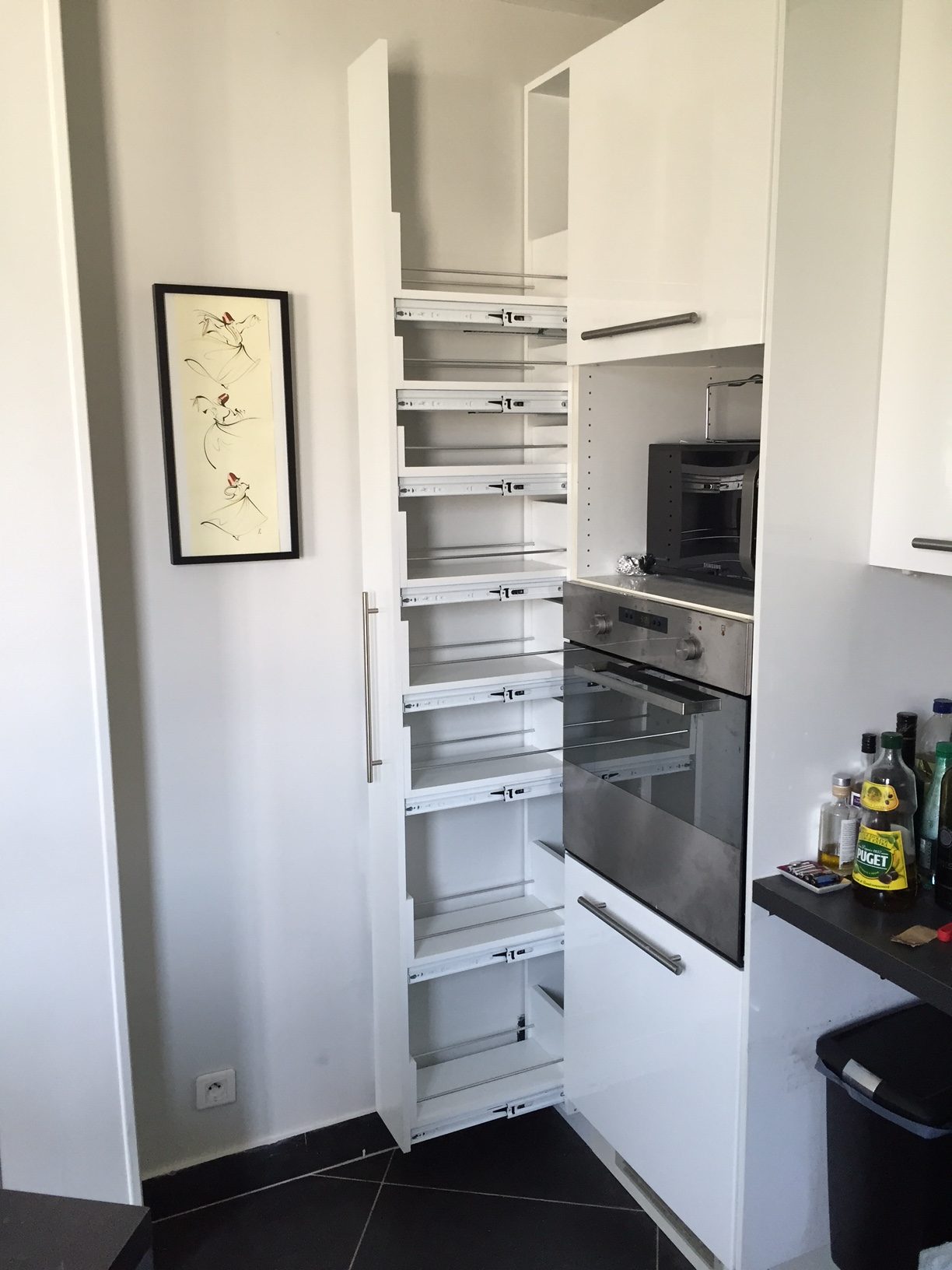 Demande du client : La cliente souhaitait optimiser un espace très étroit dans sa cuisine afin d’augmenter sa capacité de rangement.