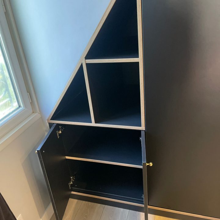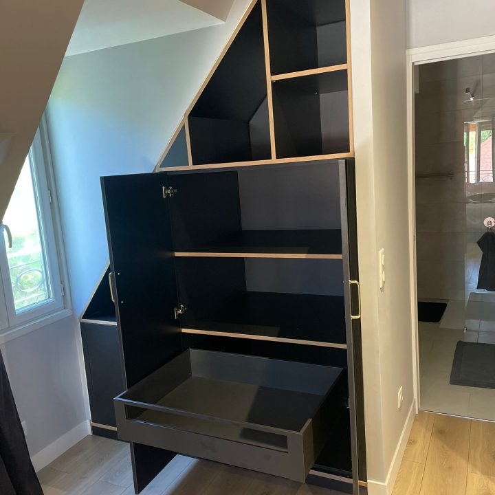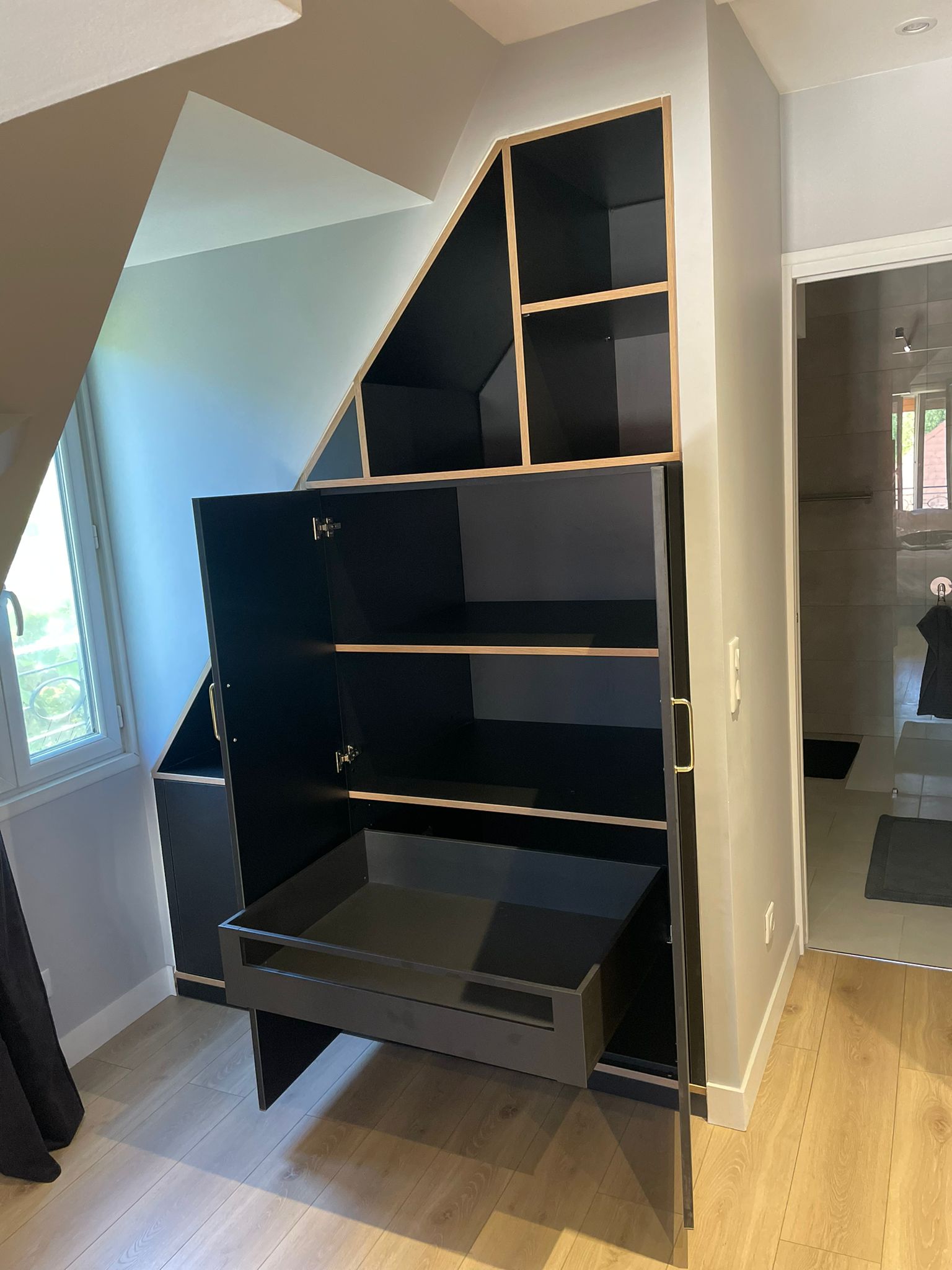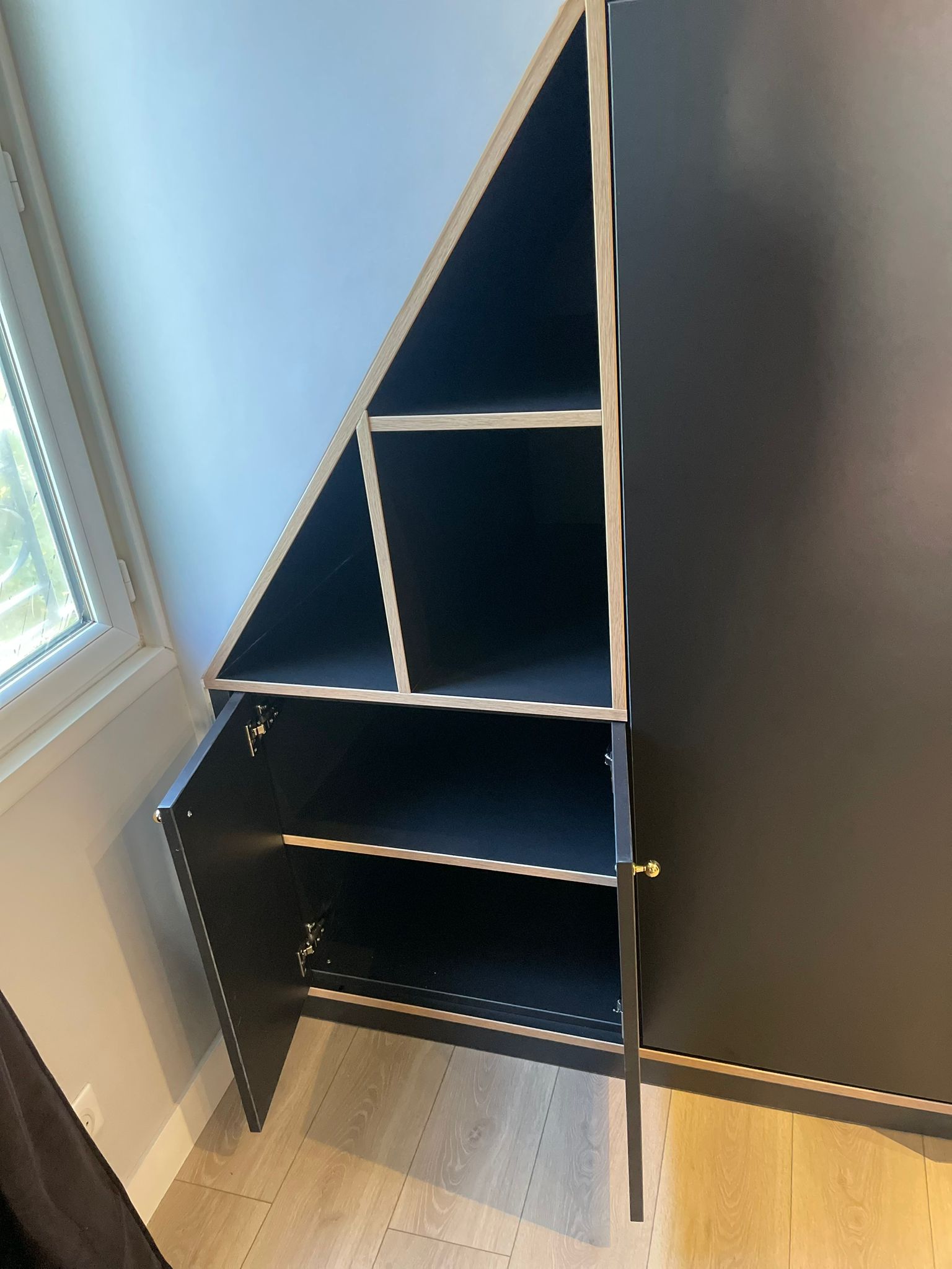 Notre solution : En atelier nous avons simplement fabriqué les deux caissons principaux. Du fait de la grande spécificité de l’espace existant et la complexité à l’aménager, la majeure partie du travail a été réalisée directement sur place afin de coller au mieux aux diverses contraintes. Le placard est fabriqué en bois noir et les chants PVC ont une finition chêne clair pour soigner le design. L’aménagement est composé d’un tiroir en aluminium noir sur mesure, de niches de rangement ouvertes et d’autres fermées par des portes battantes.