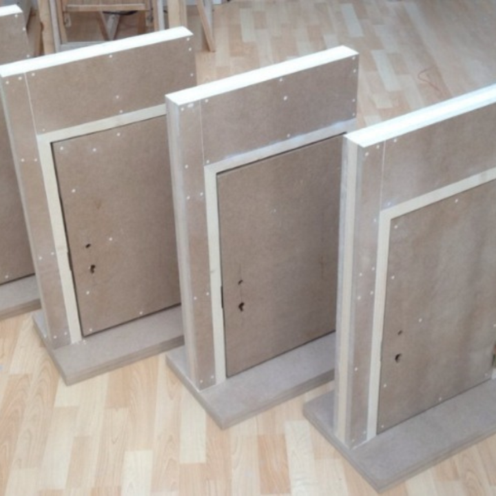 Notre solution : Dans un premier temps, nous avons fabriqué 4 éléments en médium destinés à être peints. Nous avons conçu les éléments sur mesure pour accueillir précisément le matériel du client. Par la suite, le client, entièrement satisfait, nous a sollicité à nouveau pour la fabrication de présentoirs complètement finis avec un revêtement blanc.